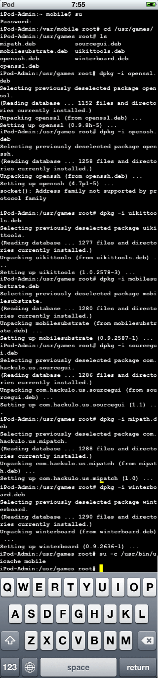 После того как Jailbreak закончился, запускаем Cydia, ждем пока закончится обновление, запускаем на плеере Terminal и набираем команды (обратите внимание на набор команд, после каждой команды нажимаем Return, не забываем ставить пробелы в нужных местах):