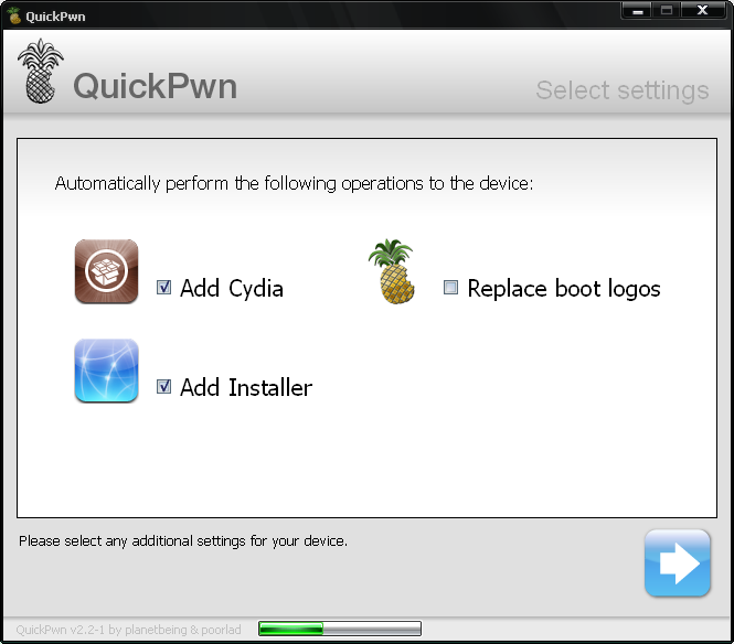 6. Нажимаем кнопку со стрелочкой, ставим галочки на Cydia и Installer, жмем Далее