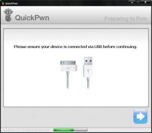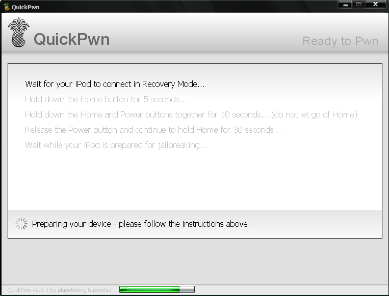 4 строчка — Отпустите кнопку Power, но продолжайте держать Home не более 30 сек (должен начать заполняться прогресс бар — зеленая полоска, если этого не произошло, вы чтото пропустили или передержали/недодержали, повторяйте прошивку через quickpwn сначала) После того как вы увидите что зеленая полоска начала заполняться отпускайте и кнопку Home