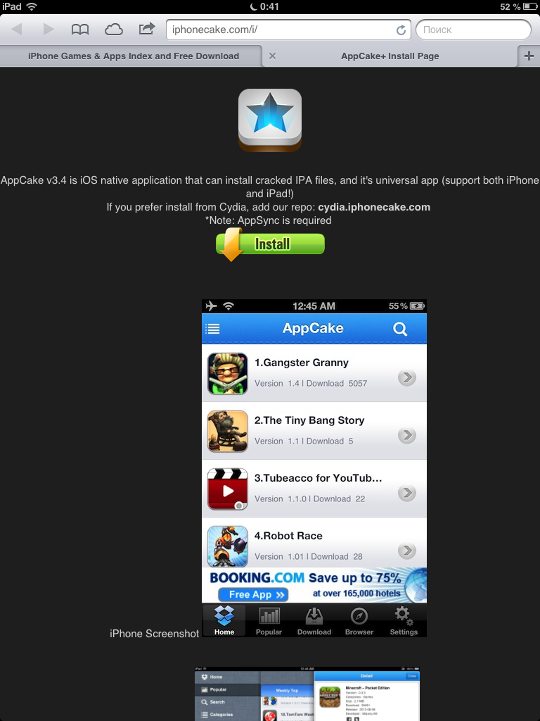 Для скачивания игр и приложений прямо с айгаджета вы можете установить приложение AppCake (замена Installous) перейдите через браузер на сайт и нажмите кнопку Install (должен быть установлен AppSync)