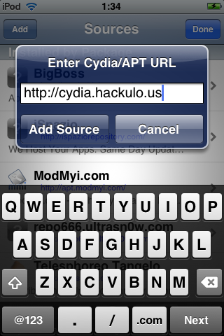 Откроется окно в котором вписываем адрес репозитория http://cydia.hackulo.us