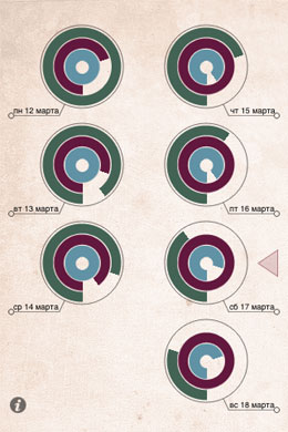 Biorhythmica, напротив – показывает ваши ритмы активности в виде стильной инфографики, причем вы можете выбрать на свой вкус один из трех предложенных графических вариантов. Кроме того, для каждого варианта программа предложит вам помощь в виде памятки — как читать тот или иной вид диаграмм. Хотя на наш взгляд, помощь здесь и не требуется.