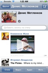 В каждом профиле эти вкладки соответствуют выбранному человеку. Во вкладке «стена» можно посмотреть личную информацию пользователя, оставить ему сообщение на стену или отправить личное сообщение, а так же прочитать и откомментировать записи на стене. В режиме просмотра информации о пользователе вы можете прямо из приложения позвонить по номеру телефона