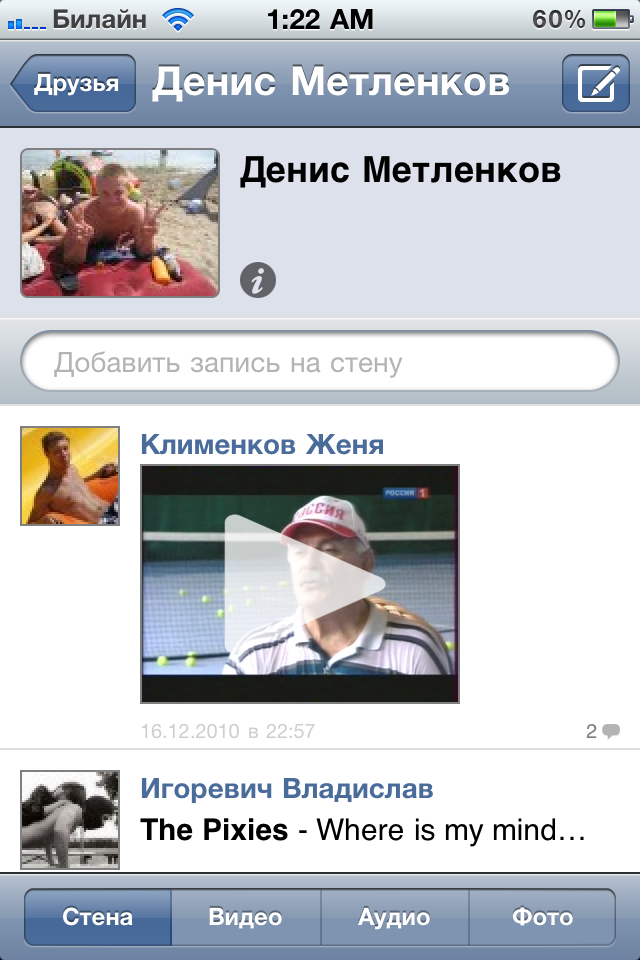 1. Профиль. Страница профиля разбита на вкладки: Стена / Видео / Аудио / Фото.