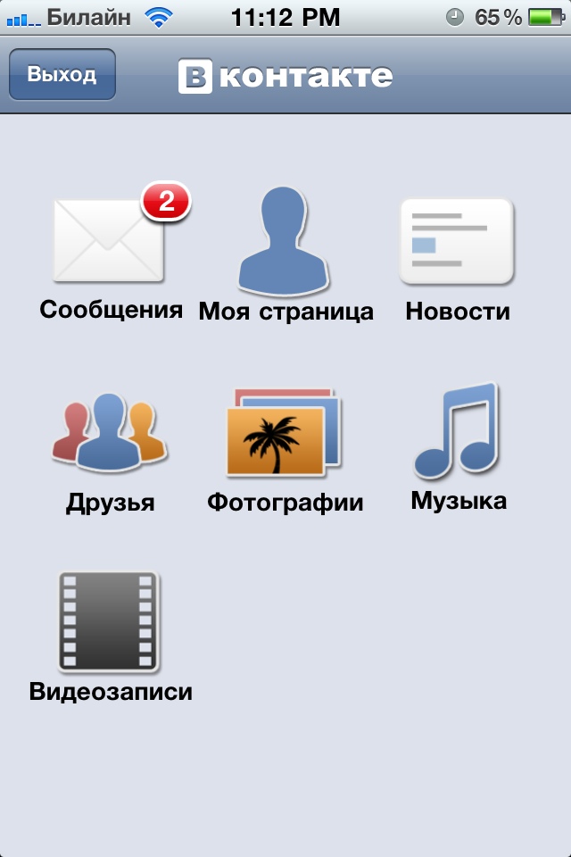 Российские разработчики пару дней назад представили всем владельцам айдевайсов свое новое приложение iВконтакте, которое позволяет пользоваться сервисами одноименной социальной сети. После ввода логина и пароля пользователь оказывается в главном меню, выполненном в виде решетки: