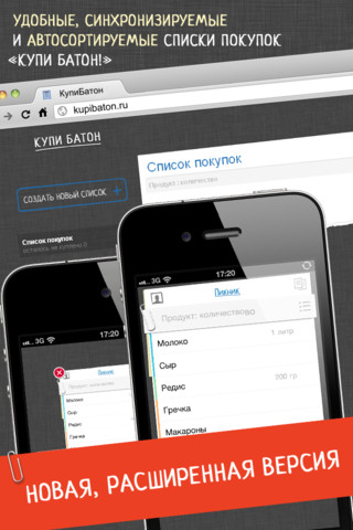 Сделайте поход за покупками удобным! Наверняка, не раз ваша «вторая половина», составив для вас список покупок, забывала что-то внести в него и звонила с просьбами купить что-нибудь еще? Новое приложение «Купи батон» позволяет решить эту проблему!
