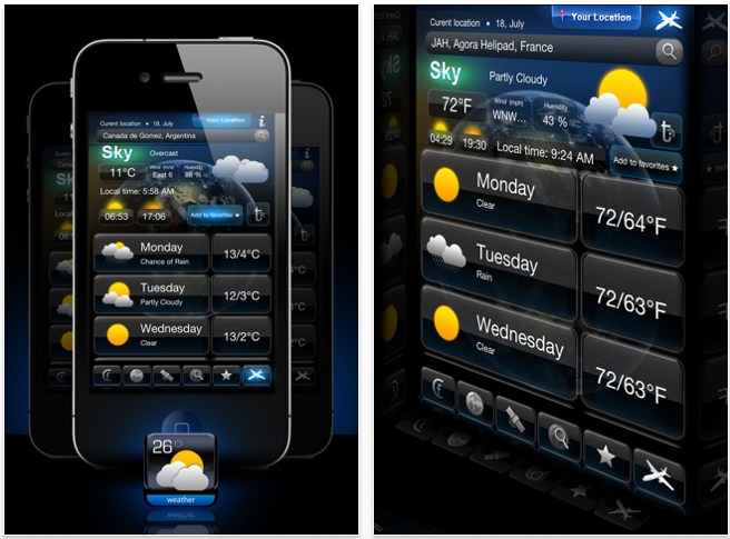 Weather Forecaster Pro (0.99$) — прогноз погоды с очень красивым дизайном. Как заявляет разработчик, программа обеспечивает самые точные показания по температуре воздуха, атмосферным осадкам, влажности воздуха и времени восхода/захода солнца. Так же программа предлагает просмотр движения облачного покрова земли, используя спутниковые фотографии. В программе присутствует поиск по городам, населенным пунктам и аэродромам.