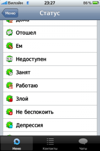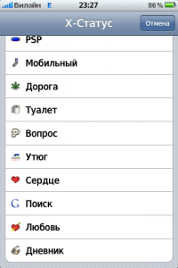 -один раз глюкнуло — при резком переходе к настройкам х-статуса и выборе — половина экрана была как будто бы закрыта чем то (список статусов исчезал под фоном) — было один раз