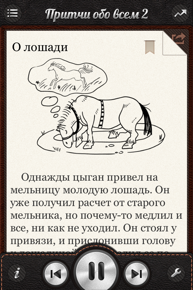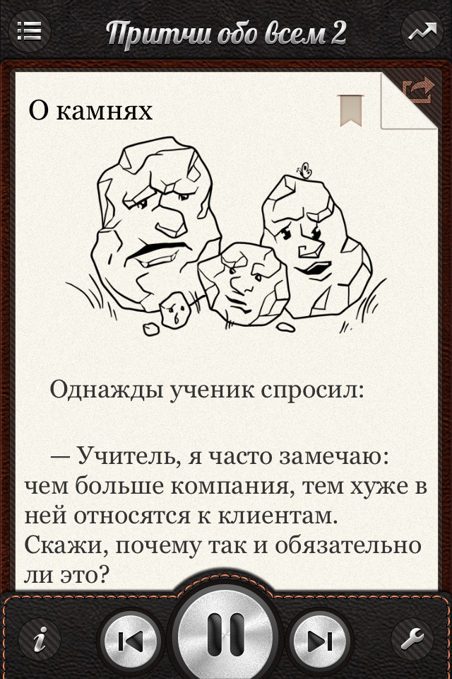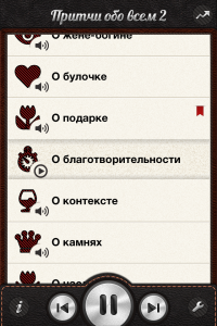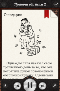 Дизайн и интерфейс программы удивительно просты: внизу размещены кнопки регулирования озвучки притч и переключения по ним. Дизайн же выполнен просто и со вкусом, сразу замечаешь, что он был нарисован хорошими дизайнерами, и само приложение не выглядит как дешевка. Данный сборник меня, честно говоря, приятно удивил, так как сделан он на славу. Слушая очередную познавательную притчу, понимаешь, сколько любви и стараний было вложено в создание этого великолепного сборника. Притчи ко всему этому просто приятно слушать, положив, к примеру, свое устройство на стол и продолжая заниматься повседневными делами в то же время обогащаться, слушая эти поучительные рассказы. Сам создатель приложения утверждает, что приложение может изменить всю жизнь человека, заставляя его действовать, по-другому смотреть на простые вещи. И я считаю, что автор прав с таким громким заявлением, ведь каждая притча это поучительная история, которую вполне себе можно сравнить со сказкой или рассказом, в которых своеобразные герои, различного типа действие и сюжет, но в том или ином герое можно увидеть самого себя, увидеть свои поступки и действия, как бы молвить «со стороны» и начать лечить собственный характер, исправлять плохие поступки, в общем, то – становиться лучше во многих критериях. Слушая притчи, вы не раз задумаетесь о жизни и вполне возможно измените представление о ней самой. Сборник является настоящим кладом для духовного обогащения человека, но все же пора заканчивать, поэтому подведем итоги. Программе «Притчи обо всем» просто нет цены, она потрясающа во всем начиная от мелких деталей дизайна и заканчивая предоставленным контентом. Данный сборник должен быть на каждом устройстве, ведь каждому полезно иногда прослушивать поучительные притчи и брать из них что-то полезное.