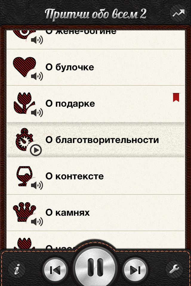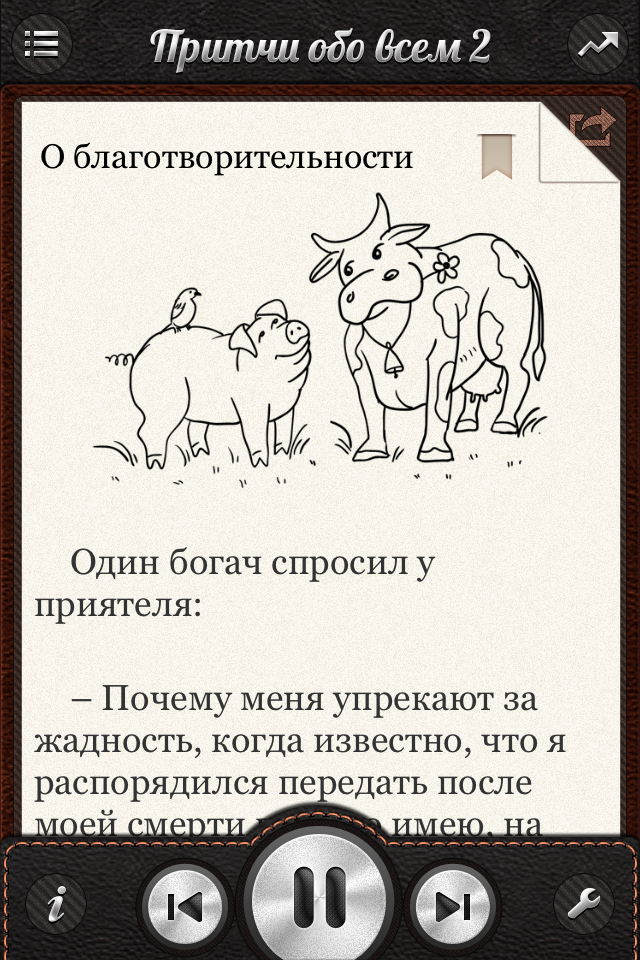 Одним из приложений на данную тематику мне приглянулся сборник «Притчи обо всем» от разработчика Vybir. Автором приложения является Иван Дзямулич, этот человек — основатель компании «Выбор» и его цель заключается в том, чтобы вывести человека на правильный путь, расширить его сознание, обогатить духовно или вовсе изменить взгляд на мир. Само же предложение «Притчи обо всем» представляет собой сборник из если не большого, то просто огромного количества притч различной тематики, которые остаются актуальными, и по сей день. Каждую притчу можно как послушать, так и прочесть по желанию. Диктор читает притчи спокойно и с интонацией в нужных моментах. Сам голос уже приносит удовольствие от прослушивания, он мягкий, спокойный, и просто приятный, нет каких-либо дефектов речи, которые могли бы помешать прослушиванию. Также при прослушивании можно услышать на заднем плане музыку: спокойные инструментальные мелодии, которые вовсе не мешают слушать притчи, а наоборот – делают прослушивание намного приятнее. Музыка к тому же помогает расслабиться и наслаждаться притчами, которые и без того отличные. Для того, чтобы прочесть озвученную притчу вам нужно всего лишь «тапнуть» по ней, после чего откроется новая страничка с текстовым вариантом притчи и иллюстрацией к каждой из них. Также можно добавить понравившейся рассказ в избранное, после чего с легкостью найти. По желанию в настройках можно настроить размер текста, казалось бы, функция не очень нужная, но здесь же и проявляется забота разработчиков к пользователям приложения. Каждый может изменить его частичку подстроив под себя и это несомненно хорошо.