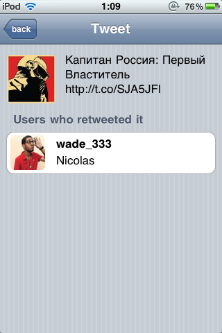 - Отсутствие возможности посмотреть профиль ретвитнувшего человека. Только ник и всё, а хотелось бы возможность увидеть краткую информацию о человеке.