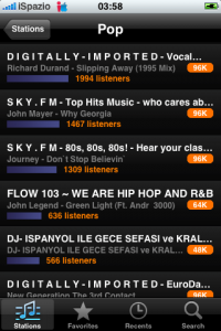 Положительным моментом является возможность использования сетей 3G, EDGE и WiFi, без каких-либо ограничений. Интерфейс очень похож на интерфейс известной программы Winamp, выбираете музыкальный жанр и стиль, выбираете радиостанцию и наслаждаетесь музыкой! Можно понравившиеся станции добавить в список предпочтений, есть возможность поиска радиостанций.