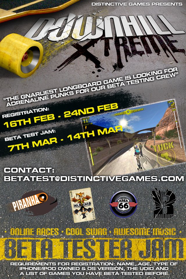Distinctive Games начинают бета-тестирование новой гоночной игры. Downhill Xtreme представляет собой полноценную 3D игру, превращающую ваше iУстройство в реактивный скейт первого класса, мчащийся по красочным локация всего мира на перегонки с сильнейшими противниками. Игровой магазин Board Store предоставит сумасшедшие доски и колеса, чтобы помочь вам достичь скорости и управления уровня профи. В игре будет присутствовать онлайн режим, так что вы сможете соревноваться с друзьями или любым другим человеком со всего земного шара. Но не забудьте потренироваться и убедиться потом, что вы лучший. На данный момент это все подробности. Учитывая список игр выпущенных разработчиками, включающий в себя Hockey Nation 2011 Pro, Bonecruncher Soccer, Football Kicks и другие, игра должна получиться как минимум хорошей.