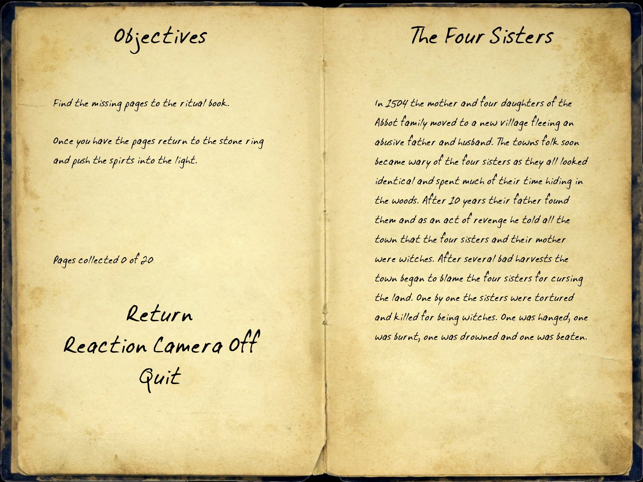 В роли детектива мы пытаемся разгадать тайну ритуальной книги, найденной в безлюдной хижине посреди лесной глуши. Простенькая завязка изложена на двух страницах: первая — заметка самого детектива, вторая — история о четырех сестрах, найденная в доме. Изучив окрестности и собрав недостающие страницы книги, необходимо направится к местному Стоунхеджу и изгнать обитающих в лесу духов куда подальше. Пока нам противостоят только блеклые призраки и зловещая черная тень с ветвистыми рогами и недобрыми красными глазками.