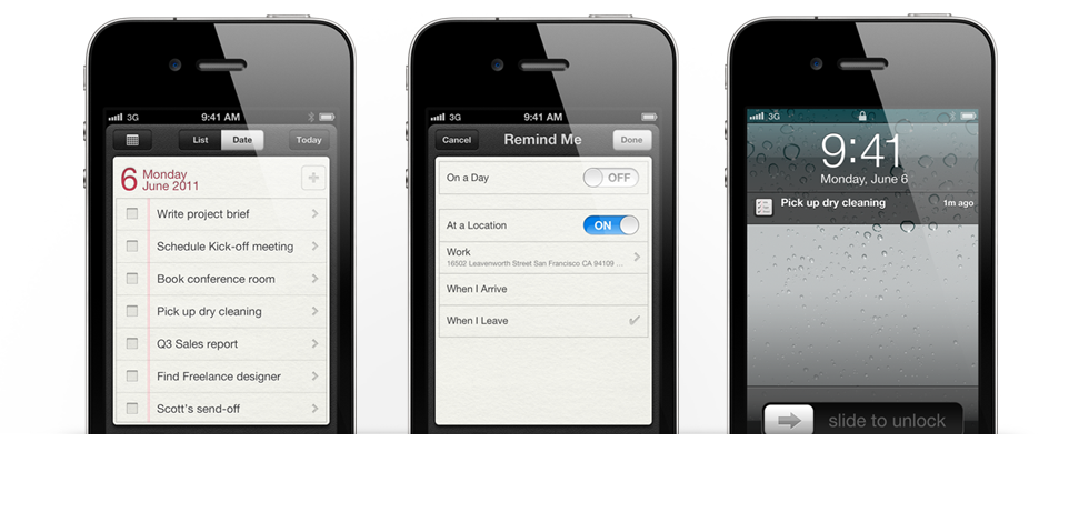 В следующий раз, когда ты будешь думать о том, что нужно сделать, ты будешь просто доставать свой iPhone/iPod Touch/iPad и просто записывать! Можно разделять по нужным тебе группам действия и назначать даты, ко всему. При этом тыможешь даже установить координаты, где должно сработать напоминание. Это напоминания будущего!