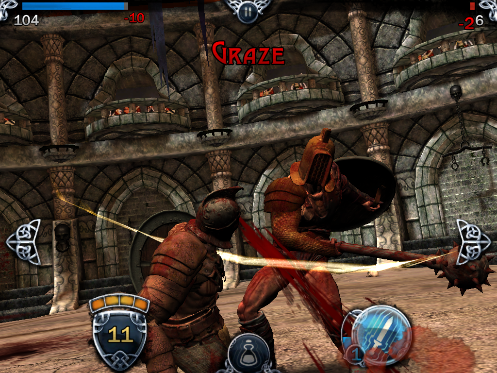 Разумеется после запуска игры, первое что замечаем это то, что это игра по механике боя является клоном Infinity Blade. Но тем не менее, здесь нет цикличности поколений, так что уже со спокойной душой можно заявить, открыт новый жанр файтингов для сенсорных устройств. Что же касается графики, так она великолепна! По крайней мере персонажи, прорисованы очень детализировано, анимация на достойном уровне, и пусть локации разнообразием не блещут, зато играть в эту игру просто удобно и приятно! А вот насчет визуализации кровавых сцен, тут все вроде бы и на месте, то есть и кровь здесь есть, и остается она на одежде и оружии гладиаторов, но не хватает тут фаталити ака Mortal Kombat, для того что бы положить устройство, встать и апплодировать разработчикам. Оно так и напрашивается само собой, когда уже в конце боя идет кураж и хочется рубить на лево и направо, внезапно все останавливается, и противник просто падает, никаких Finish him и тд. А вообще было бы просто замечательно сделать сюжет, сцены, интригу, передвижения, сторонние миссии, свободу действий, угон машин..