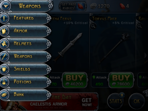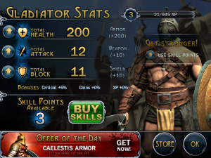 Сам геймплей же представляет собой типичный файтинг, у нас есть несколько обычных турниров, и несколько призовых, за последние мы получаем отличные вещи для апгрейда нашего гладиатора. Разумеется за победу мы получаем опыт и деньги, при достижении нового уровня — прокачиваем Здоровье, Атаку или Блокирование. За деньги покупаем обмундирование которое повышает статы персонажа. У нас есть супер удары, в случае проведения определенных комбинаций свайпов или по нажатии определенной кнопки. Есть система iAP.