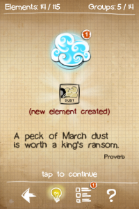 Смешиваем землю и воздух получаем пыль После каждого угаданного нового элемента играть становится сложнее, приходится смешивать каждый элемент на бум, что привносит в игру некую загадочность и подогревает ещё больший интерес к игре.