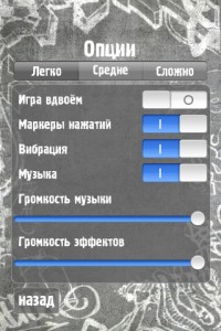 Есть три уровня сложности: легкий, когда задействовано 3 пальца, нормальный — 4 и сложный — когда используются все 5 пальцев. Для удобства игры на сложном уровне можно использовать пальцы обеих рук. Ну, или же всех четырех. Да, в игре есть режим игры вдвоем, который явно придется по вкусу владельцам iPad.