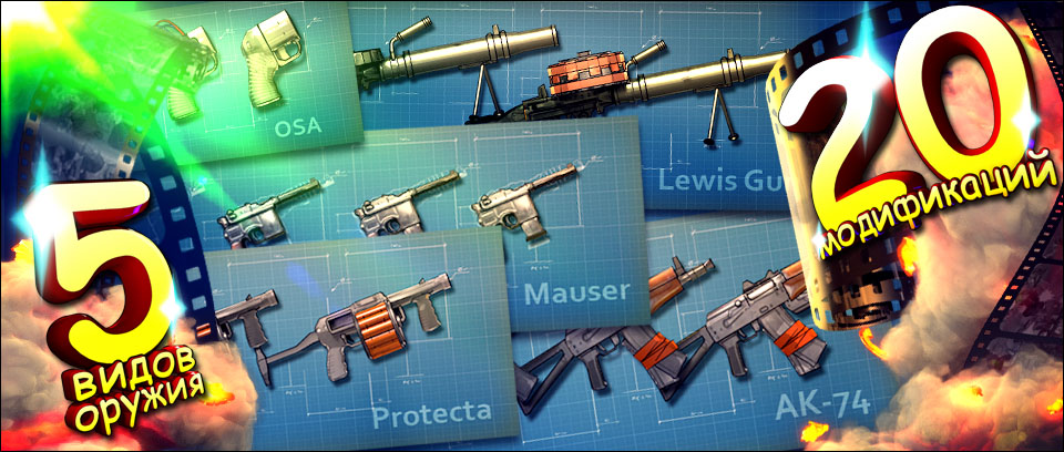 - 5 основных видов оружия и 20 модификаций для них, от Маузера до Пулемёта…