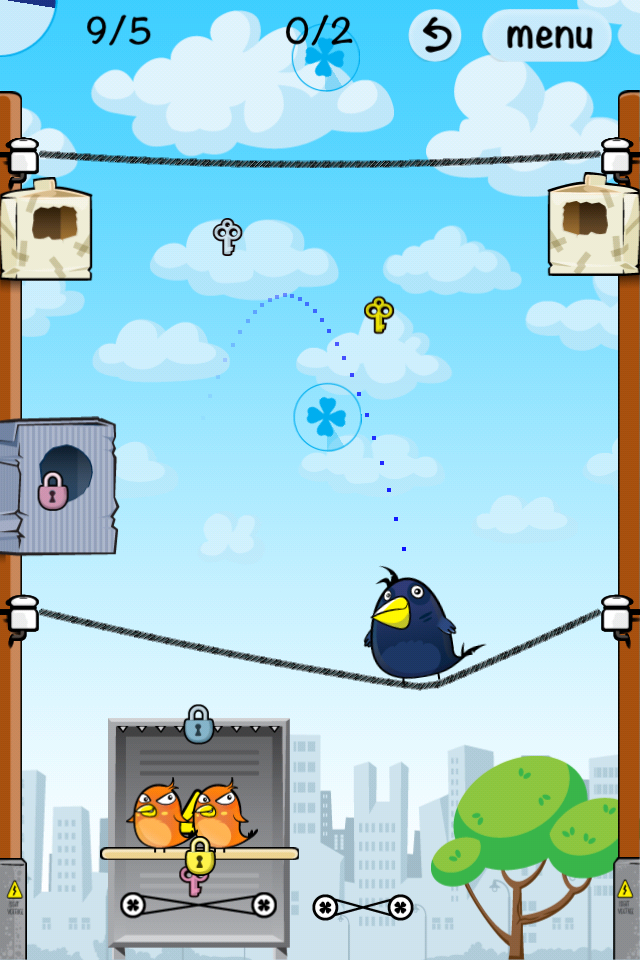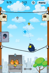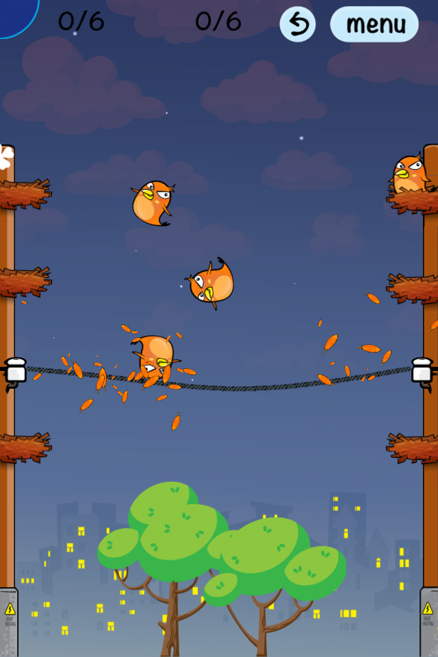 Птички прилетают на провода. Задача игрока, дергая за провода или за птичек, переместить всех птичек в домики, попутно собрав бонусы, ключики и открыв все замки. Вектор траектории способствует точному прицеливанию пернатым героем. Все надо успеть сделать за ограниченное число ходов – до наступления ночи и при этом не уронить ни одну птичку вниз.