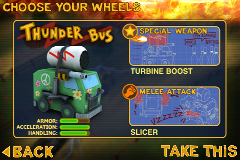 Как видно из скринов выше, у каждой машины имеется свое особое оружие. Например у хипанского автобуса со временем открываются турбо ускорение и самое интересное — боковые пилы! Очень часто в игре приходится ехать в массовке бок об бок с противником и тут самое время воспользоваться боковыми пилами, которые искрошат в пыль вашего противника за одно мгновение. Единственный минус — я не нашел в игре возможность прокачки автомобиля и оружия, все характеристики машин статичны и являются неизменными. Но игра от этого хуже не становится.