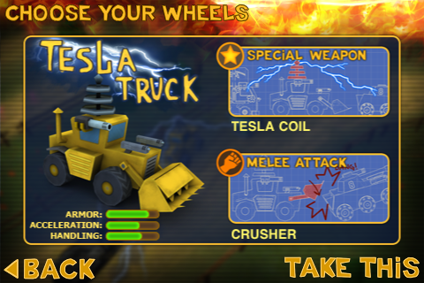 Как видно из скринов выше смысл игры остался тот же самый — в игре 4 локации, каждая из которых включает в себя 7 уровней, а в последнем уровне вам предстоит сразиться с боссом. Вам необходимо занять одно из 3-ех призовых мест, чем больше место, тем больше очков вы получите. Изначально открыты только 2 машины — навороченный хиппанский автобус и тесла-трактор.