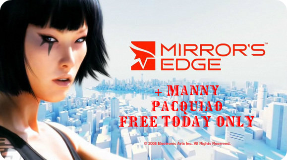 Совершенно случайно разгуливая по страничке EA Games () я наткнулся на замечательное известие! Mirror’s Edge раздается бесплатно только сегодня! Dead Space стоит на 50% дешевле! Так же игра Manny Paquiao: Pound for Pound, от другого разработчика, раздается бесплатно! Замечательная возможность приобрести эти игры тем, кто этого до сих пор не сделал.