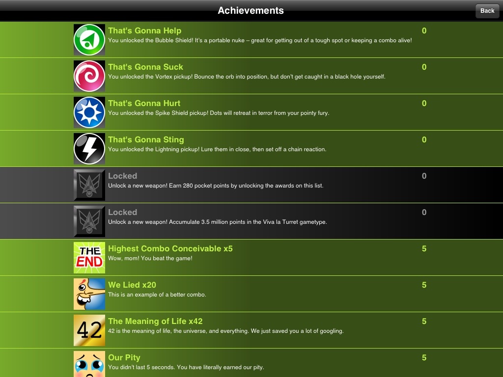 - Viva la Turret! — дополнительный режим, который можно купить за 0,99$. Здесь нам предоставляется пулемет, которым нужно расстреливать точки, чтобы они не коснулись его. Из убитых точек вываливаются кристаллы, которые нужно собирать, чтобы набирать очки. Если набрать определенное количество очков, можно открыть пулемёт в Classic и Code Red режиме.