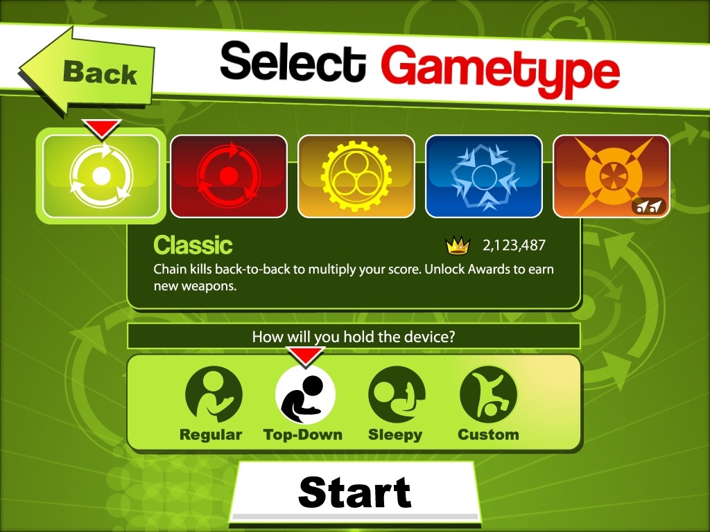 - Classic — классический режим. Здесь правила просты: нельзя касаться красных точек как можно дольше и набирать комбо, убивая их бонусами и оружием. В этом режиме работает все оружие.