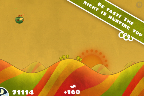 Птичка будет съезжать с холмов, чтобы затем воспарить в небо. Нужно будет правильно рассчитывать полеты, чтобы увеличивать скорость и высоту, ведь день не будет длиться вечно. И Вы должны набрать как можно больше очков, которые можно потратить на усовершенствования гнезда, в котором спит птичка.