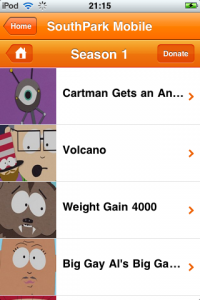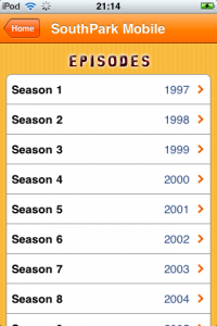 South Park Mobile приложение, с помощью которого можно посмотреть все серии South Park (на английском). Выберите сезон, выберите серию и начните просмотр после 10 секундного ожидания. Загрузка роликов может тормозить так как слишком много посетителей.