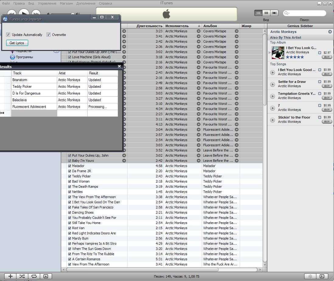 Первый способ , это автоматическое добавление текстов с помощью плагина к тунцу под названием ITunes lyrics Importer. Скачать свежую версию вы можете его на (ссылка справа под названием Download). Скачайте и установите его. Откройте тунец и наш плагин. В тунце выберете нужные песни, поставьте в плагине галочку на update automaticaly (иначе он будет показывать текст ка каждой песне и вы должны будете принять его, а он никогда (почти) не ошибается) нажмите get lyrics. Через некоторое время слова будут вшиты (если нет, то он покажет к каким). Ничего незнаю по поводу русской музыки, т.к. такое не слушаю. Вот скриншот его работы