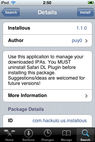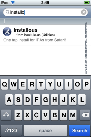 В Cydia выбираем пункт Search и набираем installo и ставим программу Installous (это как раз установщик *.ipa)