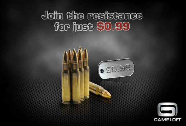 «Вступай в сопротивление всего за 0.99$», так гласит громкая надпись на картинке. Судя по изображению пуль, нас ждет очередная стрелялочка. Причем всего за 0.99$. В последнее время Gameloft щедры на игры стали, то Let’s Golf 3 бесплатными выпустили, то обещают новый экшн за копейки. Чем это будет чревато, узнаем позже, как в случае с Let’s Golf 3.