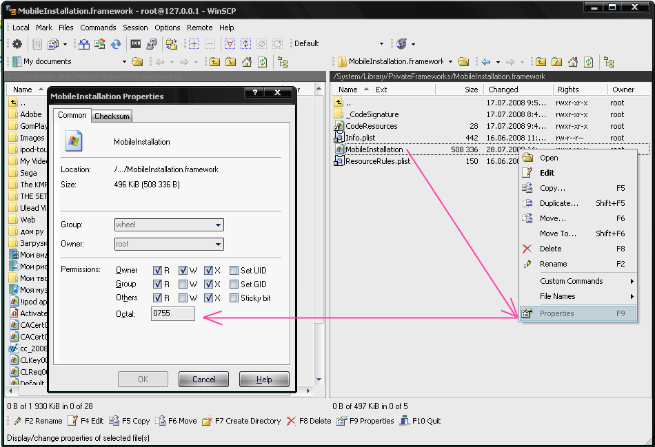 Для установки прав на файл или папку, выбираем нужный файл, жмем правую кнопку мыши -> Properties и ставим необходимые права.