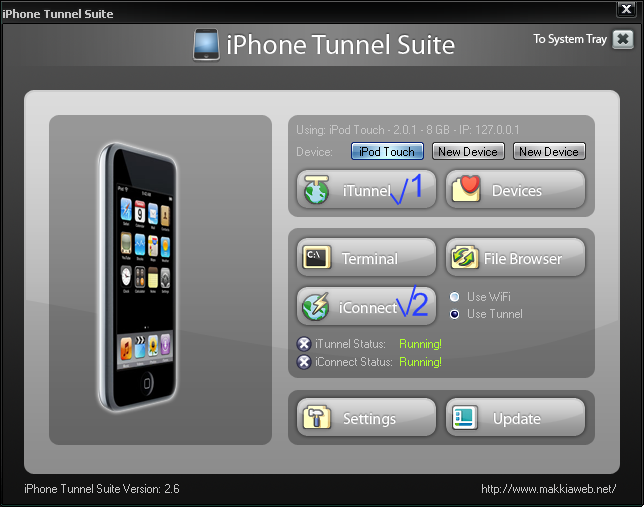 Вобщем, установил я iPhone Tunnel Suite, у меня iPod Touch 2.2.1, когда я нажимаю iConnect он на какой-то миг становится зелёным, пишет Running, но сразу же отключается, пишет Stopped, что делать!?