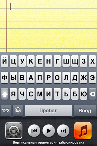 Теперь для того, чтобы вызвать окошко управления музыкальным плеером, нужно два раза нажать на кнопку домой,таким образом вызвав мудьтизадачность и перелистнув иконки влево, можно найти кнопки управления плеером и кнопку блокировки поворота экрана. Включив эту функцию, вы сможете «серфить» в интернете, печатать в почте, блокноте лежа, а альбомы не будут переходить в режим cover flow. Раньше это было неудобно, потому что экран постоянно переворачивался.