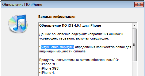 iOS4.0.1 вышла, в ней всего лишь одно изменение, касающееся этих трёх устройств: улучшение формулы определения количества полос для индикации мощности сигнала.