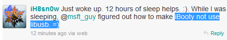 К данному моменту времени, у нас уже полпервого ночи по Москве и идёт дождь. А iH8sn0w сообщает о работе над iBooty без LibUSB после 12 часового перерыва