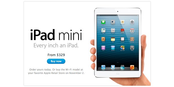 Сегодня утром на официальном сайте компания Apple предоставила возможность предварительного заказа iPad mini. 16Гб версию можно приобрести за 329 долларов, 32Гб – за 429 долларов и 64гб – 529 долларов. Первая партия устройств будет выпущена 2 ноября в 8 часов утра. Читать далее →